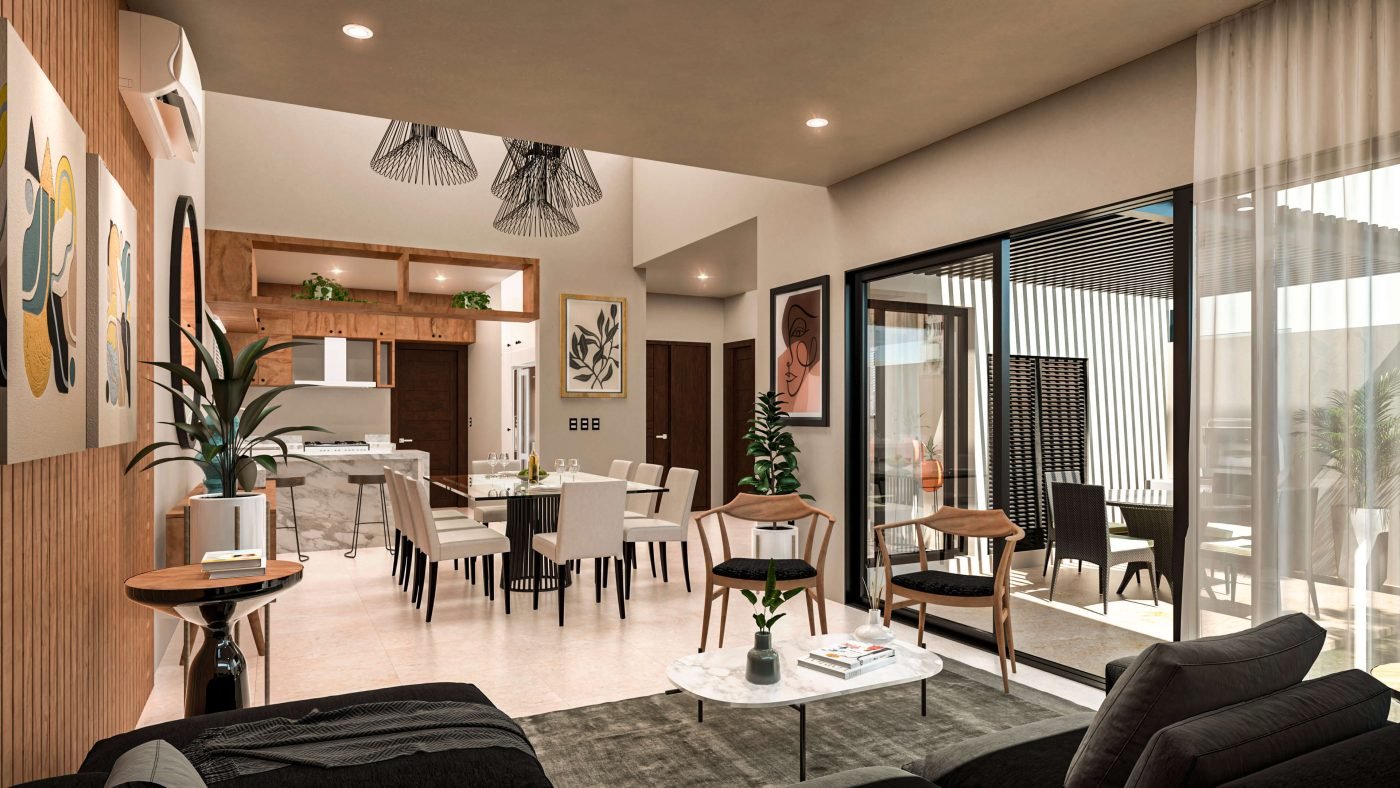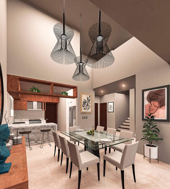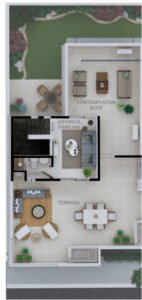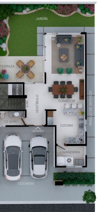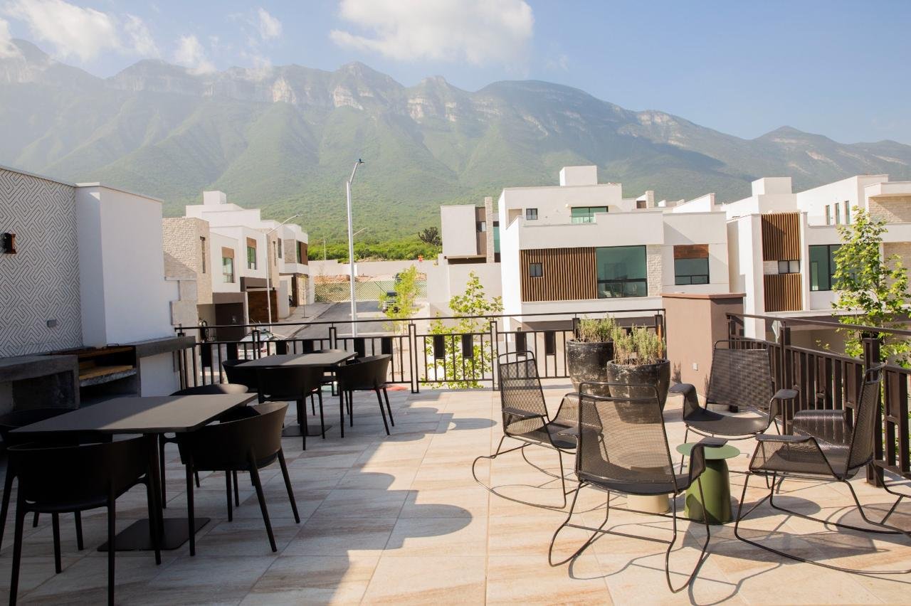 Para combinar con las mejores vistas, cuenta con un patio en forma de ‘L’ que abraza los espacios de convivencia. Su terraza con modernos acabados en el tercer nivel, regala una increíble estancia sin límites para tus reuniones.
